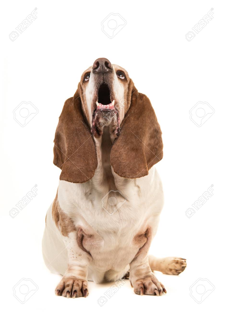 Basset Hound Sitting And Looking Up With Its Mouth Open Seen From The Front Isolated On A White Background Stock Photo Picture And Royalty Free Image Image 81416489